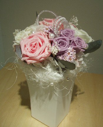 | 白い花器にピンク・ホワイト・ラベンダーカラーのローズを中心にきらきらしたりぼんとパールをあしらい、かわいらしいアレンジにしてみました。 |
