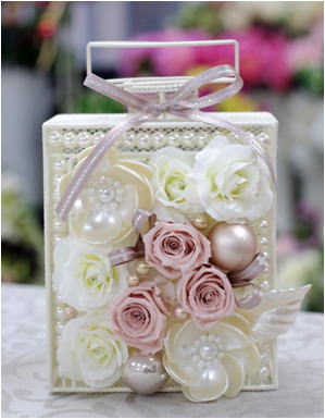 *プリザーブドローズ大1輪、小3輪、アジサイ、カスミ草、アートSPホワイトローズ、フラワーピック、リボン、パール等が使用されています。 SIZE:13W×6D×13H cm (自然加工品であるためお写真と実物が若干異なる場合がございます。予めご了承ください。) |