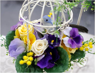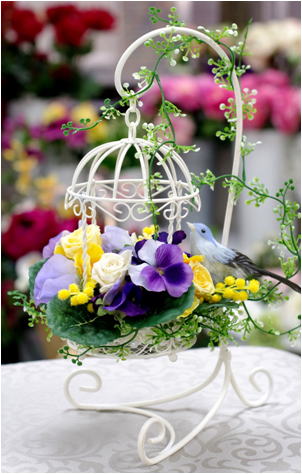 *プリザーブドローズ小3輪、アート小花、ミモザ、パンジー、グリーン、小鳥ピック等が使用されています。 SIZE:15W×15D×30H cm(鳥かご部分10×10×15) (自然加工品であるためお写真と実物が若干異なる場合がございます。予めご了承ください。) |
