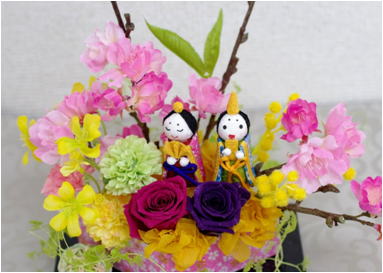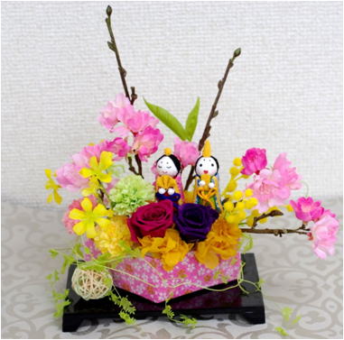 *プリザーブドローズ小2輪、あじさい、マム、桃の花、ビバーナム、小花、和リボン、水引紐、ひな人形等が使用されています。 SIZE:15W×5D×25H cm (自然加工品であるためお写真と実物が若干異なる場合がございます。予めご了承ください。) |
